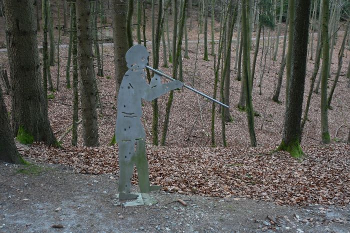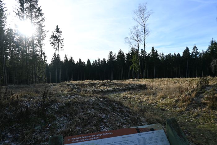Über die Kanonenstraße, am Parkplatz vorbei, ist leicht rechts versteckt ein weiteres kleines Kastell, das sogenannte „Kleinkastell Altes Jagdhaus“. Hier waren nur 20-30 Römer stationiert. Wenn ich mir den Umriss so anschaue – klein trifft es. Also groß gewohnt hat wohl keiner der Soldaten. Leicht links über einen Trampelpfad bin ich wieder auf dem Weg. Hier an der Stelle ist der Limeserlebnispfad gleich mit dem Limesradweg, der hier auch entlangläuft. Der ist allerdings ein wenig länger als 85 Kilometer, nämlich 1100 Kilometer.