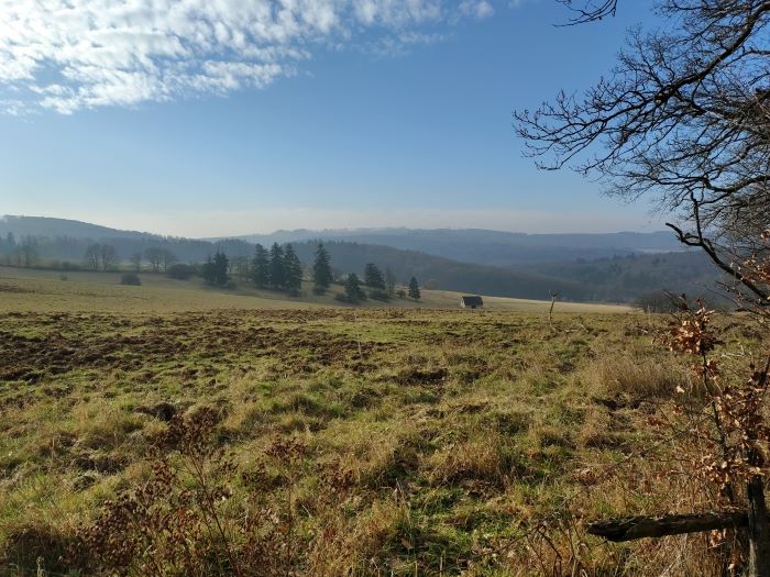 Aber für uns geht es nach Querung einer weiteren Straße weiter auf unserem Weg. Nun geht es heute ausnahmsweise mal bergan. Hier an dieser Stelle fehlt tatsächlich mal ein Zeichen, welcher der beiden Trampelpfade der richtige ist. Wir entscheiden uns für den rechter Hand und nach rund 150 Metern taucht auch wieder ein Zeichen auf. Hier laufen wir wieder auf einer Erhebung, die mit etwas Fantasie der Limes sein könnte. Die Form der Aufhäufung lässt die Vermutung zu. Wir kommen aus dem Wald heraus, überblicken weit die Ebene in Richtung Dasbach und machen an einer Bank in der Sonne eine weitere Pause. Der Tee muss geleert und die gekauften Brötchen vom Morgen verbraucht werden. In der Ferne am Ende des Tales sehen wir einen weiteren Turm, den wir heute aber nicht mehr besichtigen werden.